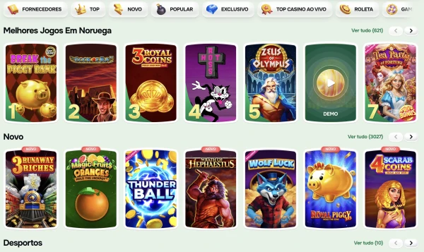 O nosso lobby foi concebido para ser organizado, mesmo com 12.000 títulos, para que possa filtrar por categoria, fornecedor ou funcionalidade. As slots são o foco principal, mas também oferecemos uma boa mistura de jogos de mesa, mesas ao vivo e uma secção de sportsbook fácil de aceder na navegação principal. Se gosta de rondas rápidas, também encontrará jogos crash, além de Bingo e Keno para um ritmo mais lento. Este equilíbrio ajuda a alternar entre estilos sem mudar para outro site.